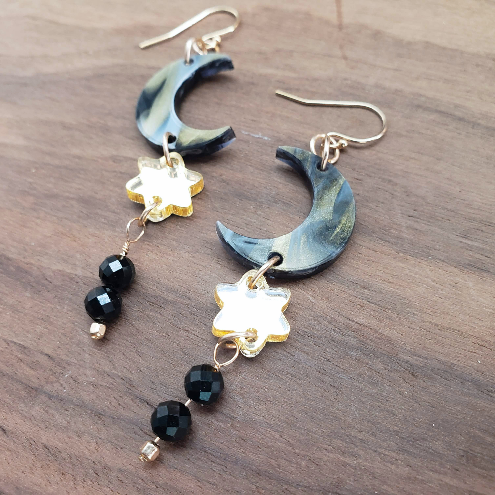 Black, gold, and blue/white hazy and mirrored gold acrylic. Faceted black spinel beads. 14kt gold filled components.
