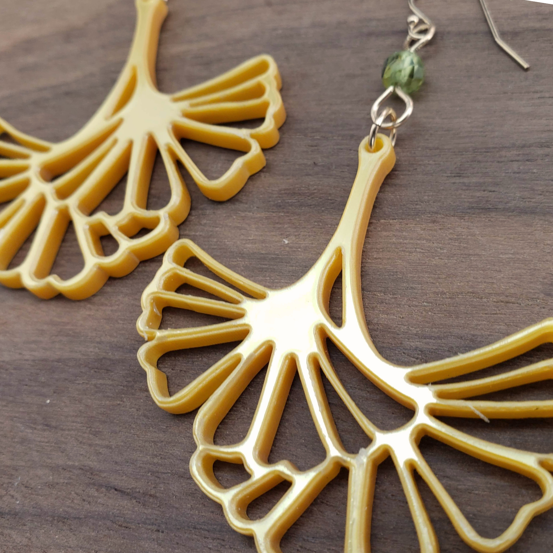 Ginkgo trees are the last remaining species of a primitive family of plants so ancient that it is commonly known as a “living fossil.” In the fall, the intense golden hue of their distinctively-shaped leaves are stunning and inspired these unique earrings.