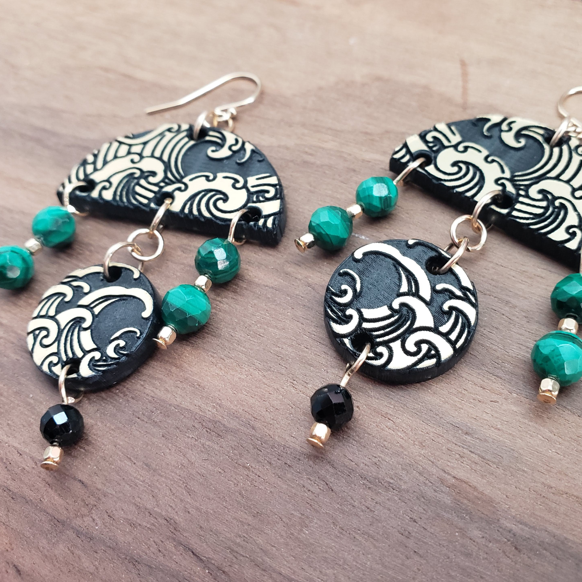 Inspired by the intricate inlays found on vintage and antique Japanese jewelry boxes, these dimensional earrings shine a matte gold contrasted by a deep black. Richly accented by hanging black spinel and green malachite beads, they are eye-catching at every angle while feather-light.