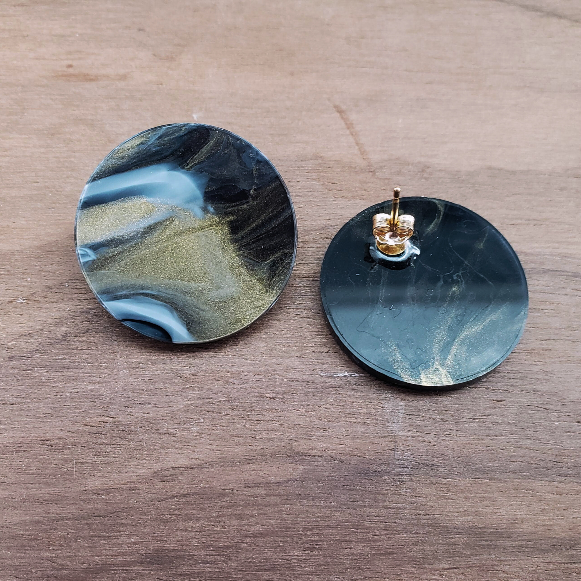 Black with white and gold accents hazy acrylic. 14kt gold filled components.