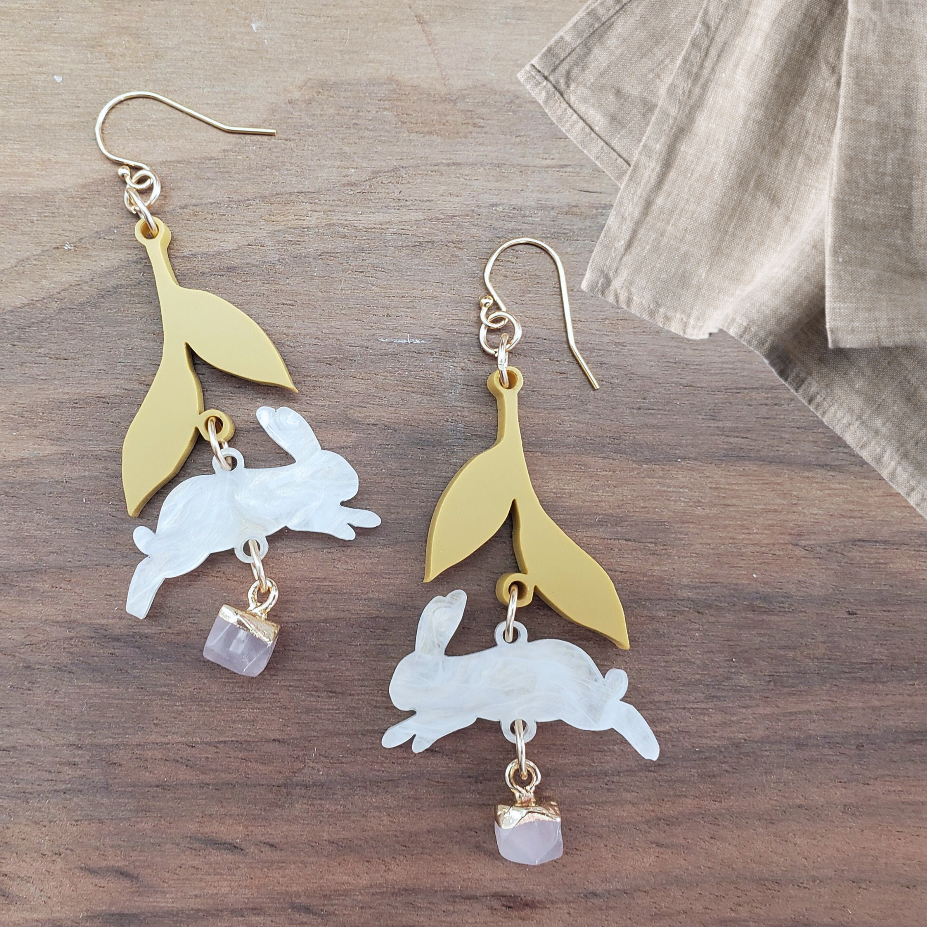 Celebrate the vitality of spring with these whimsical leaping rabbits, framed between foliage and a soft pink rose quartz stone.