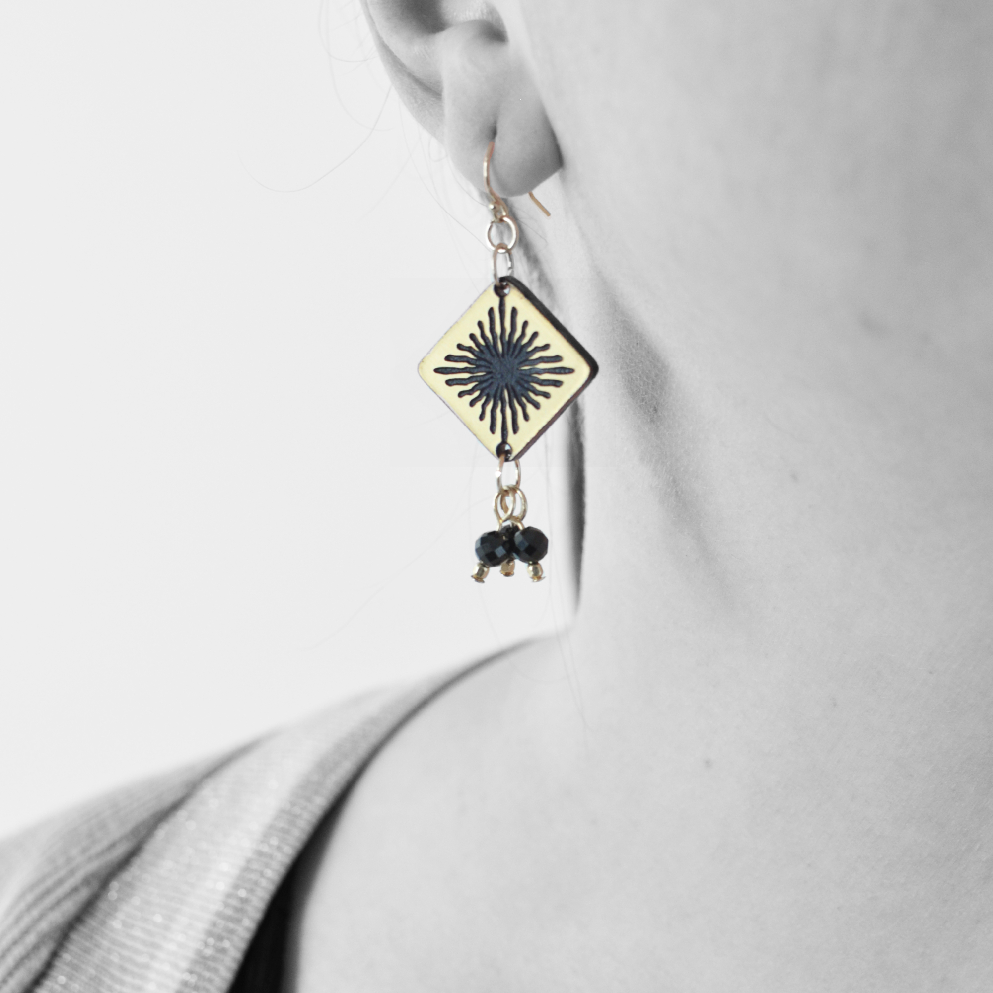 Two-tone black and gold acrylic. Faceted black spinel and 14kt gold-filled beads. 14kt gold filled components.