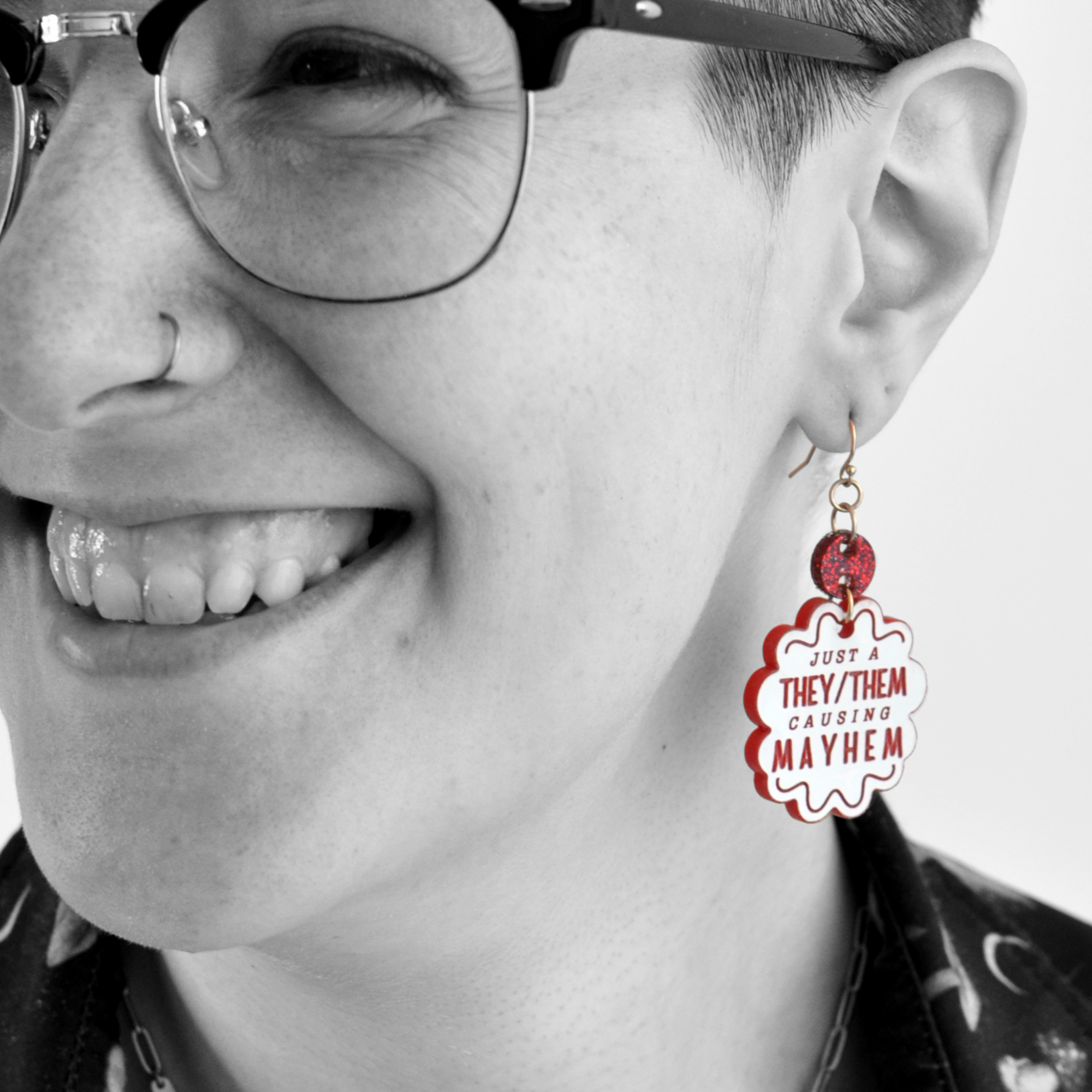 White to red engraved acrylic. Red glitter acrylic. 14kt gold filled components.